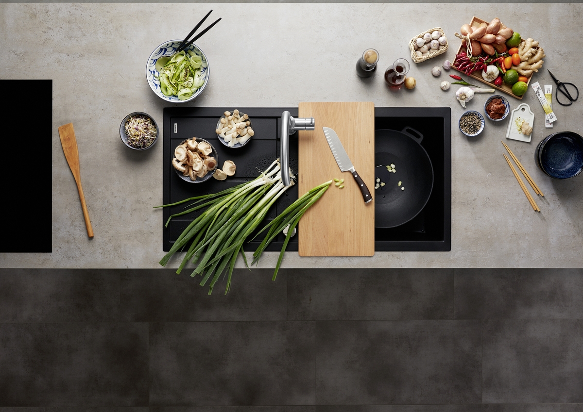 • pribor kot opcija: deska za rezanje iz masivnega bukovega lesa ali iz bele umetne mase in košara za posodo iz nerjavnega jekla s snemljivim stojalom za krožnike